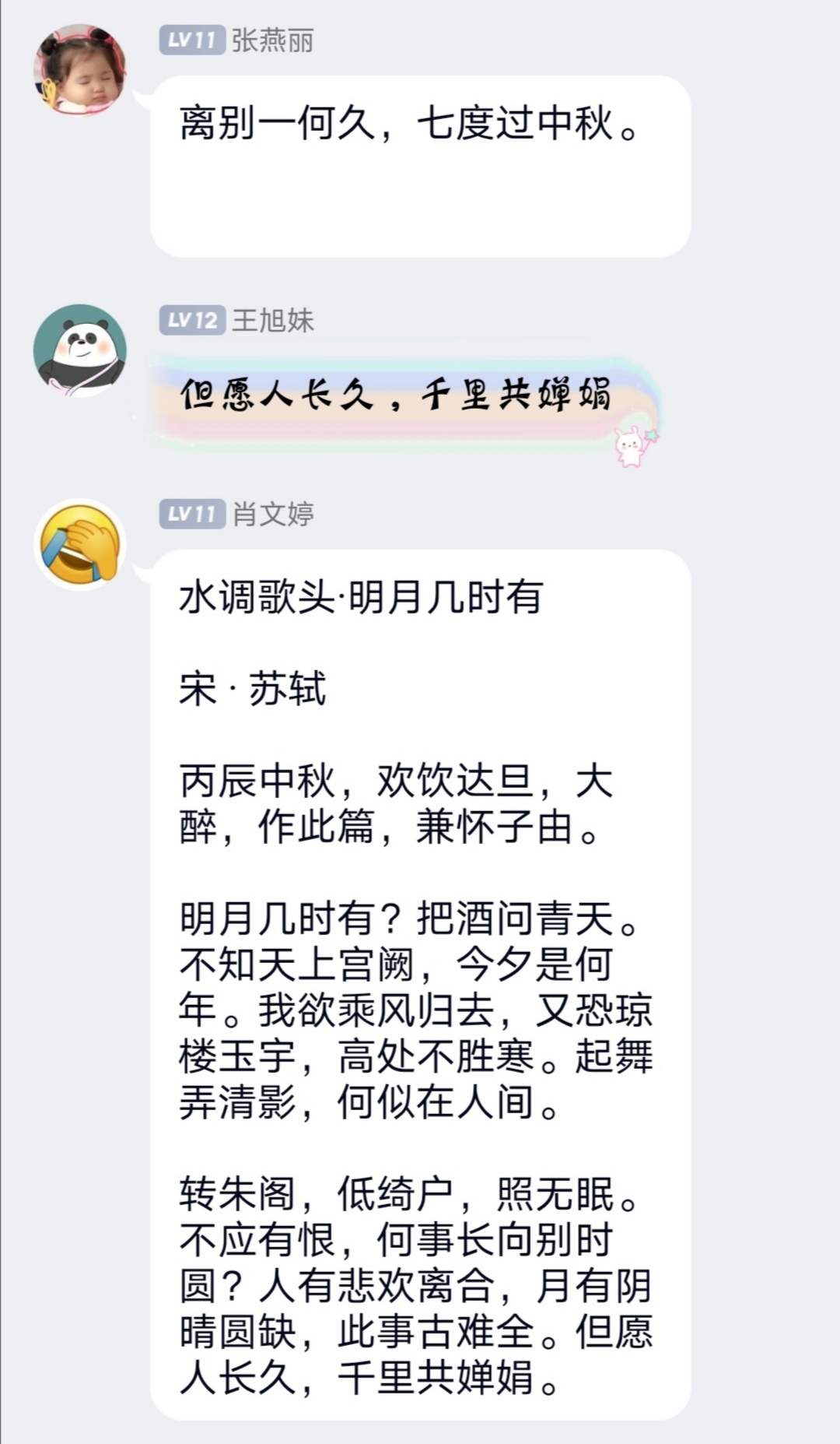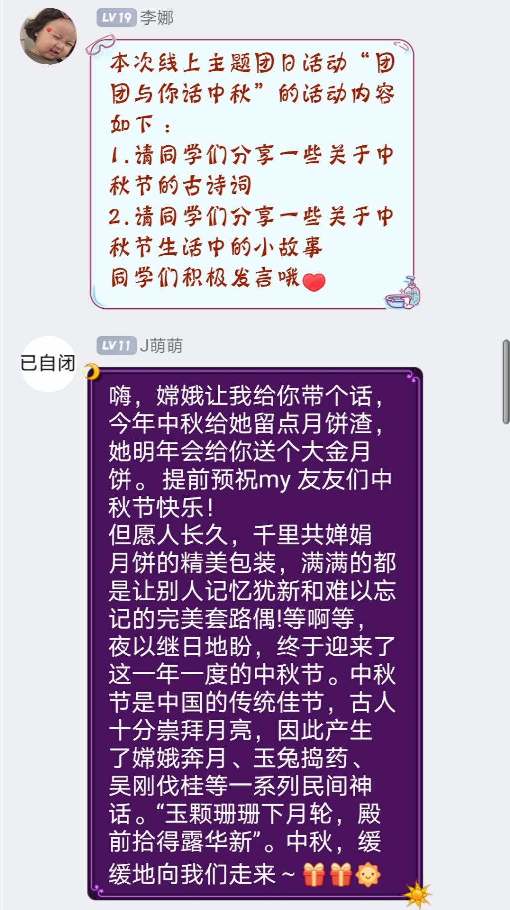 首先是2017级-2019级各团支部各自召开了丰富多彩的线上线下主题团日活动。各团支部通过了解中秋节的由来、分享中秋节的故事、畅谈中秋节的习俗、探讨中秋节的诗词及其寓意,使团员们不仅了解到了更多的中秋节知识、习俗,还对中国这一传统佳节及传统文化有了更深层次的了解和热爱,使中华传统文化得到更好的传承。