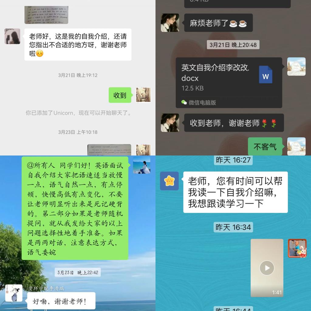 培训期间,各位党员对同学们进行了精准培训,帮助他们修改英文自我介绍,并准备了大量常见的复试口语问题和恰当的答案,让同学们能够有的放矢,做好充分的准备。在此基础上,教工党员和研究生党员还积极组织同学们开展模拟面试,以便熟悉复试流程,调整好心态应对面试。在各位党员的帮助下,同学们对考研的英语复试环节有了更清晰的认识,明确了英语复试的准备方向。同学们纷纷表示参加本次活动令他们获益良多,他们有充足的信心能够成功“上岸”。