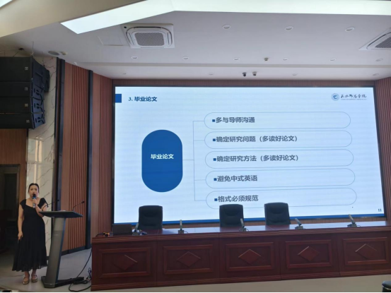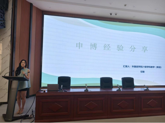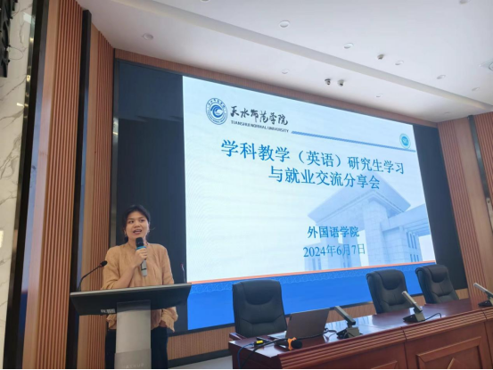 张敖同学在研究生就读期间获得校级奖励三项,省级奖励六项,发表学术论文一篇,目前已成功考取山东省一所市级初中的英语教师岗。她提醒在场的研究生在校期间要重视课程学习,积极参加各类教学比赛。同时,她劝诫大家在论文选题、研究、写作和修改等各个环节都给予足够的重视。