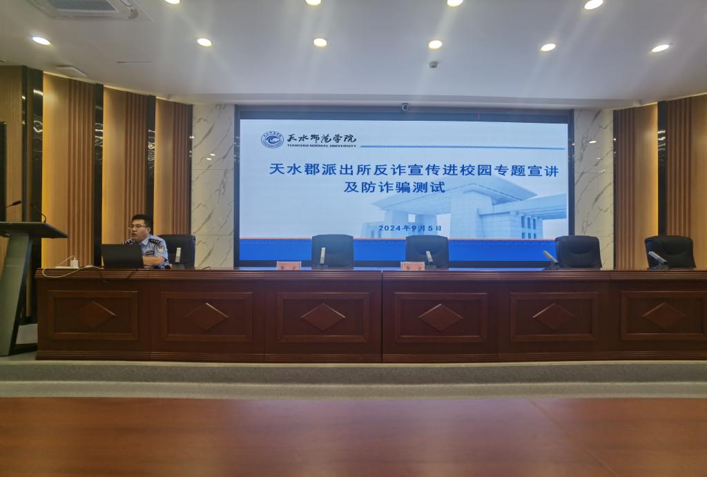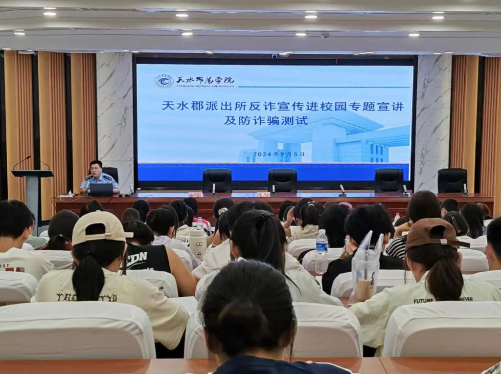 9月5日下午,国产乱伦视频特邀天水郡派出所副所长杨逢周,在1号报告厅为2024级新生作“揭秘网络骗局,共筑安全防线”为主题的反诈专题报告,国产乱伦视频2024级全体新生现场聆听此次报告。