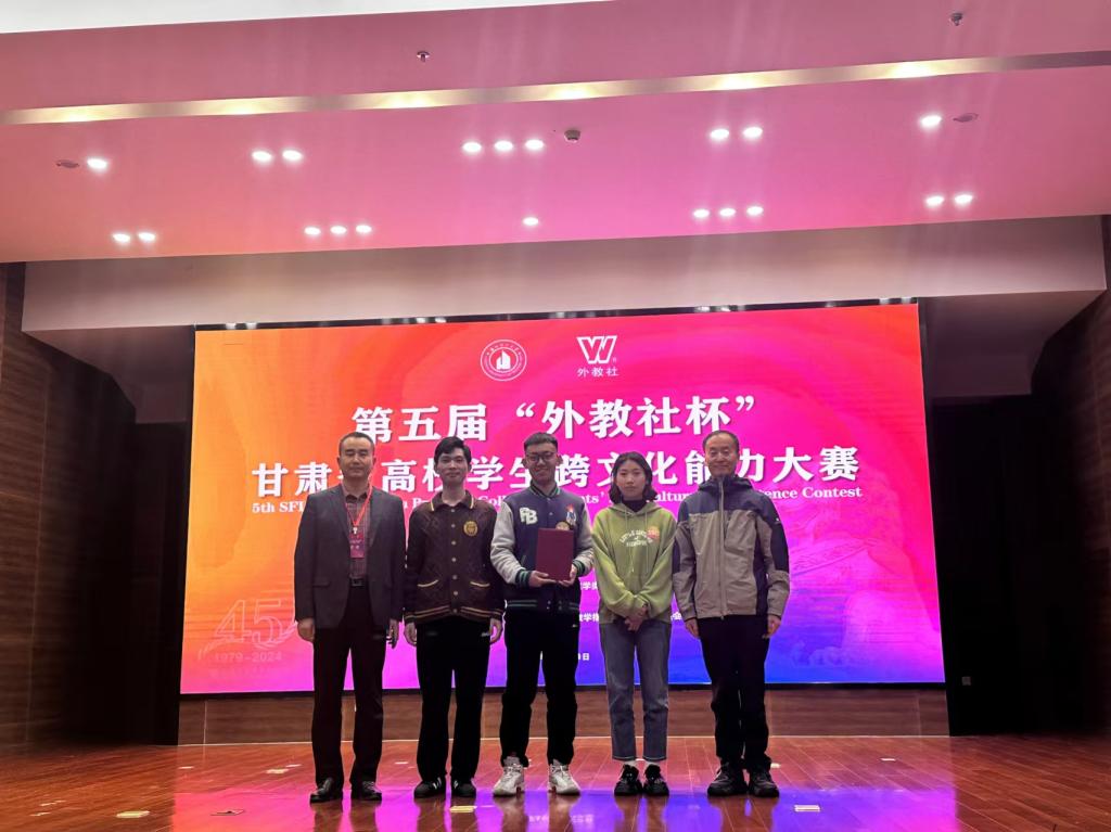 10月19日,第五届“外教社杯”甘肃省高校学生跨文化能力大赛决赛在兰州理工大学举行。我校英语专业阎旭、汉语言文学专业李梦云和应用化学专业张轩组成的代表队荣获大赛二等奖。