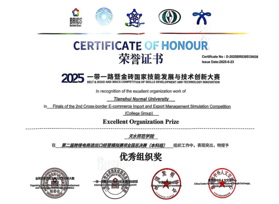 在2025年6月举行的“一带一路”暨金砖国家技能发展与技术创新大赛第二届跨境电商进出口经营模拟赛项全国总决赛中,我校商务英语系代表队凭借扎实的专业功底和卓越的实战能力,从全国50所参赛高校中脱颖而出,荣获二等奖,我校同时荣获优秀组织奖。本次大赛由金砖国家工商理事会技能发展工作组、“一带一路”暨金砖国家技能发展国际联盟、教育部中外人文交流中心等权威机构联合主办,旨在推动跨境电商领域的技术创新与国际化人才培养,吸引了近百所高校的精英团队同场竞技,竞争激烈。我校代表队的优异表现彰显了我校在跨境电商人才培养方面的优势与实力。