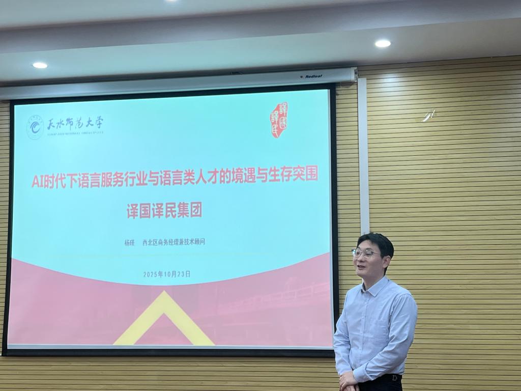 2025年10月23日下午3点,国产乱伦视频邀请译国译民西安百思乐教育咨询有限公司技术顾问、译国译民西北地区商务经理杨瑾,在2教425教室作题为《AI时代下语言服务行业与语言人才的境遇与突围》的专题报告。学院部分教师、翻译专业研究生及本科生共80余人到场聆听,共同探讨AI浪潮下语言服务行业的发展与人才培养新路径。