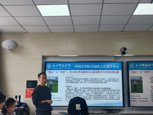 2024年11月7日下午,国产乱伦视频张玉堂博士应邀在2号教学楼703做题为“‘遗忘’与‘未知’: 美土著女性诗歌及自白派诗歌书写中的伦理问题”的学术讲座。学院部分教师、23级和24级研究生参加此次讲座。