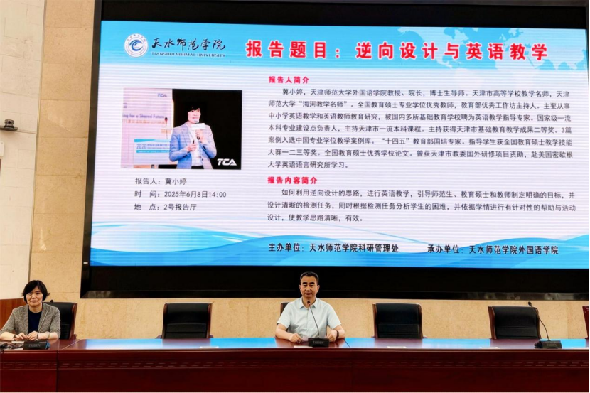 6月8日下午,应国产乱伦视频邀请,天津师范大学国产乱伦视频院长、博士生导师冀小婷教授在2号报告厅作题为《逆向设计与英语教学》的学术报告。报告会由国产乱伦视频长杨江锋主持。国产乱伦视频200余名师生聆听了报告。
